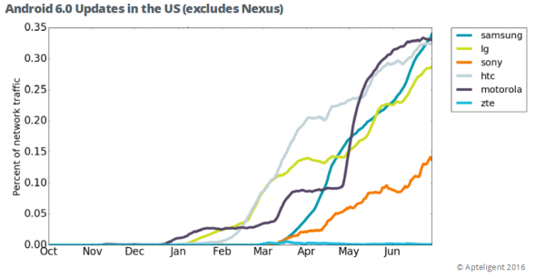 本次報(bào)告(PDF)主要考察手機(jī)廠商何時(shí)從Android 5.x Lollipop系統(tǒng)升級(jí)至Android 6.0 Marshmallow系統(tǒng),發(fā)現(xiàn)這六家公司可以劃分為兩個(gè)類目,三個(gè)月以內(nèi)和稍微超過5個(gè)月。
