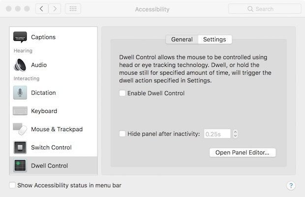 駐留控制:這是 macOS Sierra 加入的一大功能,駐留控制可以讓用戶使用頭部或眼部追蹤技術(shù)控制鼠標(biāo)。在這里你可以為駐留控制設(shè)置一些動(dòng)作,例如左右點(diǎn)擊、雙擊、拖拽等。