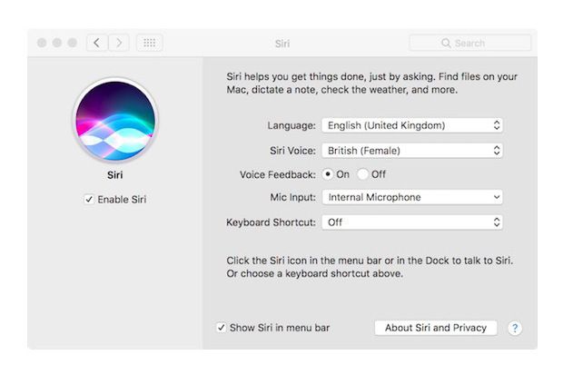 在這里你可以根據(jù)需要開啟和關(guān)閉 Siri,此外還可以進(jìn)行語言設(shè)置、語音設(shè)置、開啟和關(guān)閉語音反饋、設(shè)置導(dǎo)入的麥克風(fēng)以及設(shè)置鍵盤快捷方式。最后,你還可以讓 Siri 出現(xiàn)在菜單欄中(默認(rèn)開啟),另外還可以查看更多關(guān)于 Siri 和隱私方面的信息。