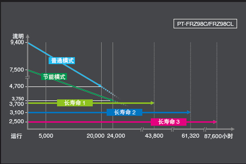 在普通模式下,PT-FRZ98C/FRZ98CL投影機可連續(xù)運行20,000小時**5。在節(jié)能模式下,運行時間將延長至約24,000小時*2。這些模式適用于教育及數(shù)字標(biāo)牌行業(yè)應(yīng)用。