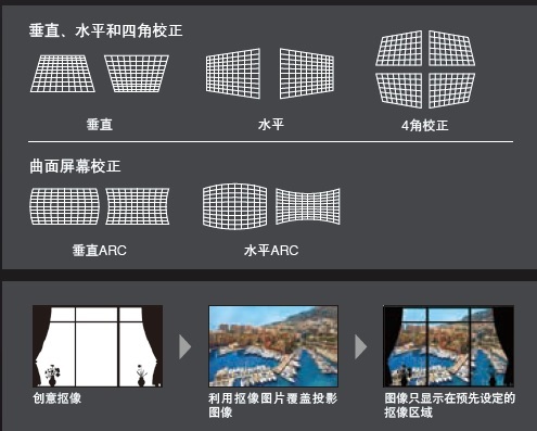此功能可以對投射在球狀、圓柱狀或其它特殊曲面形狀屏幕的圖像進行幾何校正。只需使用遙控器就可以輕松的進行調(diào)試,無需外接其它任何設(shè)備。結(jié)合多畫面拼接系統(tǒng),可在多種演出和活動應(yīng)用中實現(xiàn)富有創(chuàng)造性的投影。