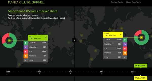 同時,在中國最大的城市地區(qū),Android系統(tǒng)所占份額比去年同期高了4.8個百分點,達到了78.8%,而iOS所占份額由去年同期的25.2%下降到了20.1%。